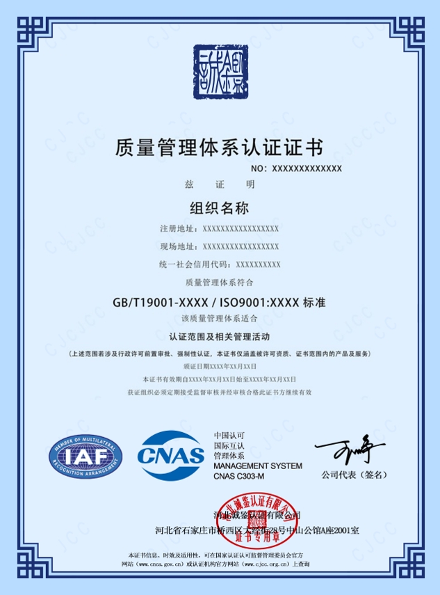 河北誠(chéng)鑒認(rèn)證有限公司(簡(jiǎn)稱誠(chéng)鑒認(rèn)證/CJCC),創(chuàng)立于二零一七年,經(jīng)國(guó)家認(rèn)證認(rèn)可監(jiān)督管理委員會(huì)(CNAS)批準(zhǔn)(批準(zhǔn)號(hào)CNCA-R-2018-412),中國(guó)合格評(píng)定國(guó)家認(rèn)可委員會(huì)(CNAS)認(rèn)可(注冊(cè)號(hào):CNAS C303-M)),是從事質(zhì)量管理體系、環(huán)境管理體系、職業(yè)健康安全管理體系認(rèn)證,具有獨(dú)立法人資格的第三方認(rèn)證機(jī)構(gòu)。